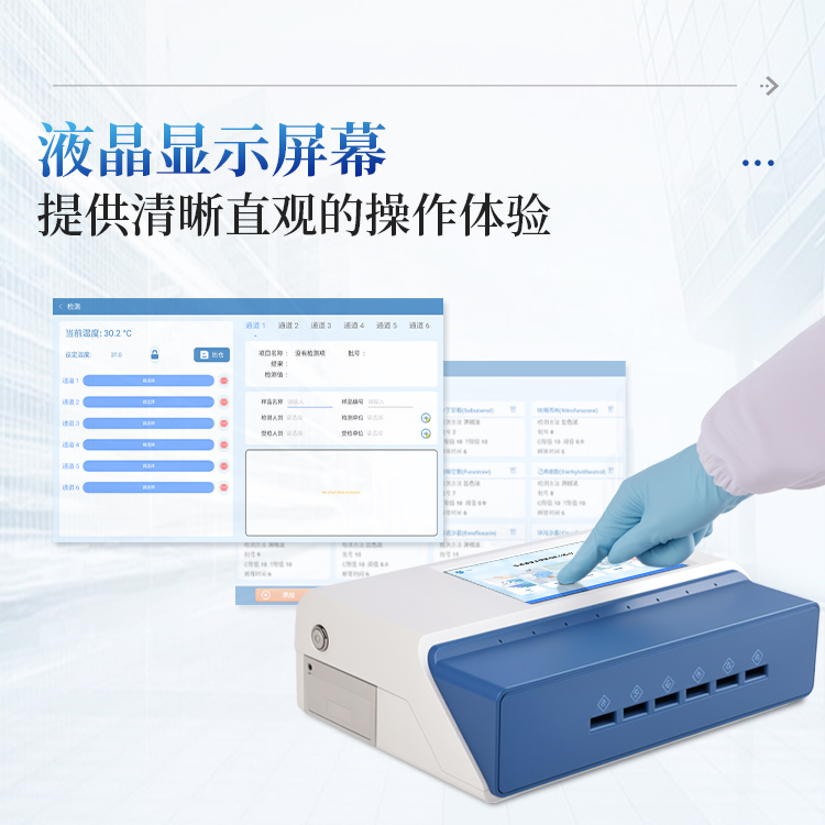 简要描述: 兽药残留快速检测仪多通道同步检测:支持6通道,可同时检测多个样本,提高效率。高精度光学系统:采用多波长LED光源(650nm)及高灵敏度光电传感器,减少误差。智能化操作:触摸屏控制,内置质控功能;支持二维码扫描录入样本信息,避免人工错误。